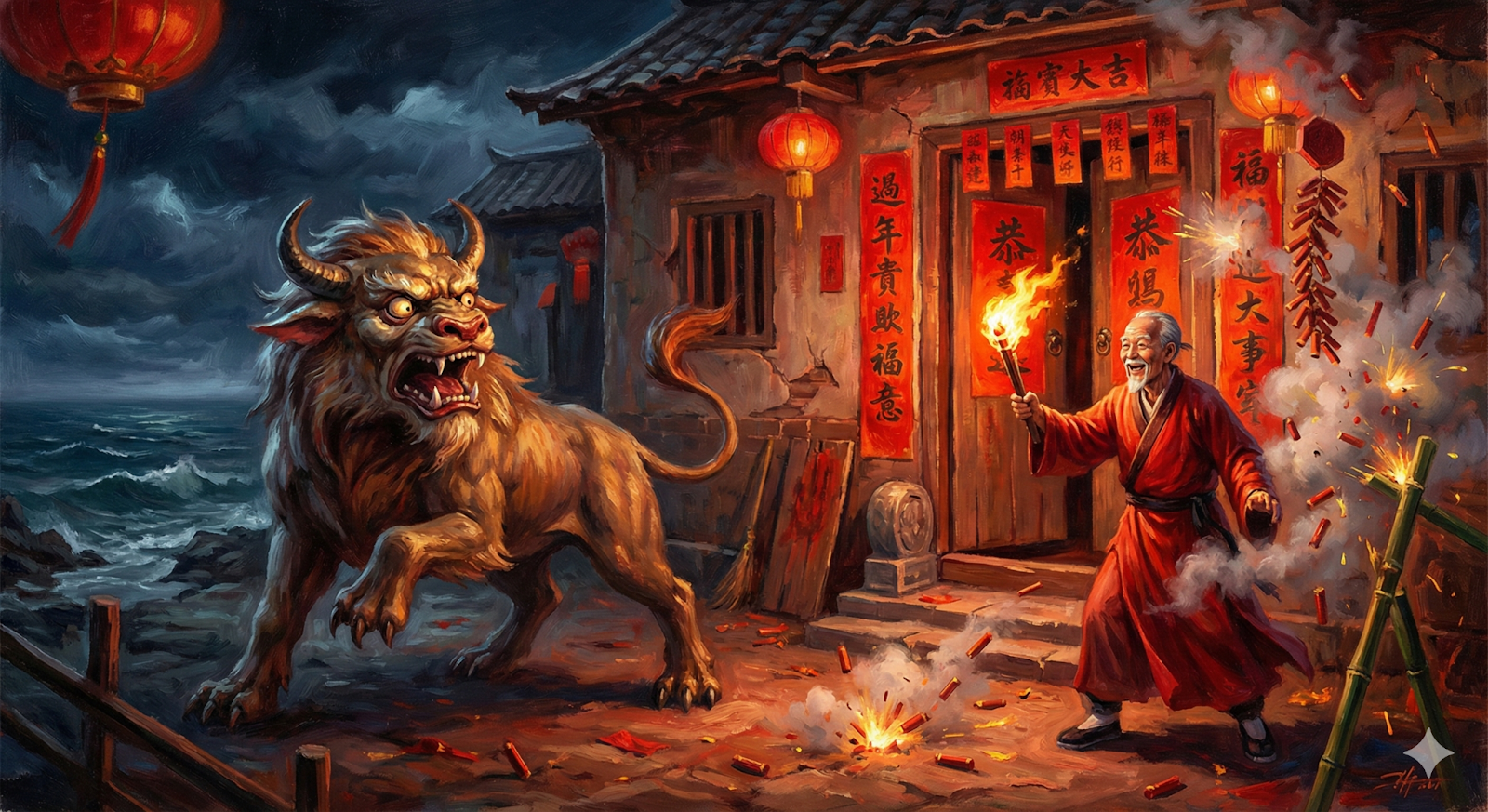 ยังไม่ทันที่มันจะตั้งตัว เสียงระเบิดดัง “ปัง! ปัง! ปัง!” (ซึ่งเกิดจากการเผากระบอกไม้ไผ่ในสมัยนั้น ส่วนประทัดพึ่งถูกคิดค้นมาเมื่อ 1,000 กว่าปีที่ผ่านมา ) ก็ดังสนั่นหวั่นไหว ทำเอาเจ้าเหนียนที่ดุร้ายถึงกับตัวสั่นงันงกด้วยความหวาดกลัว