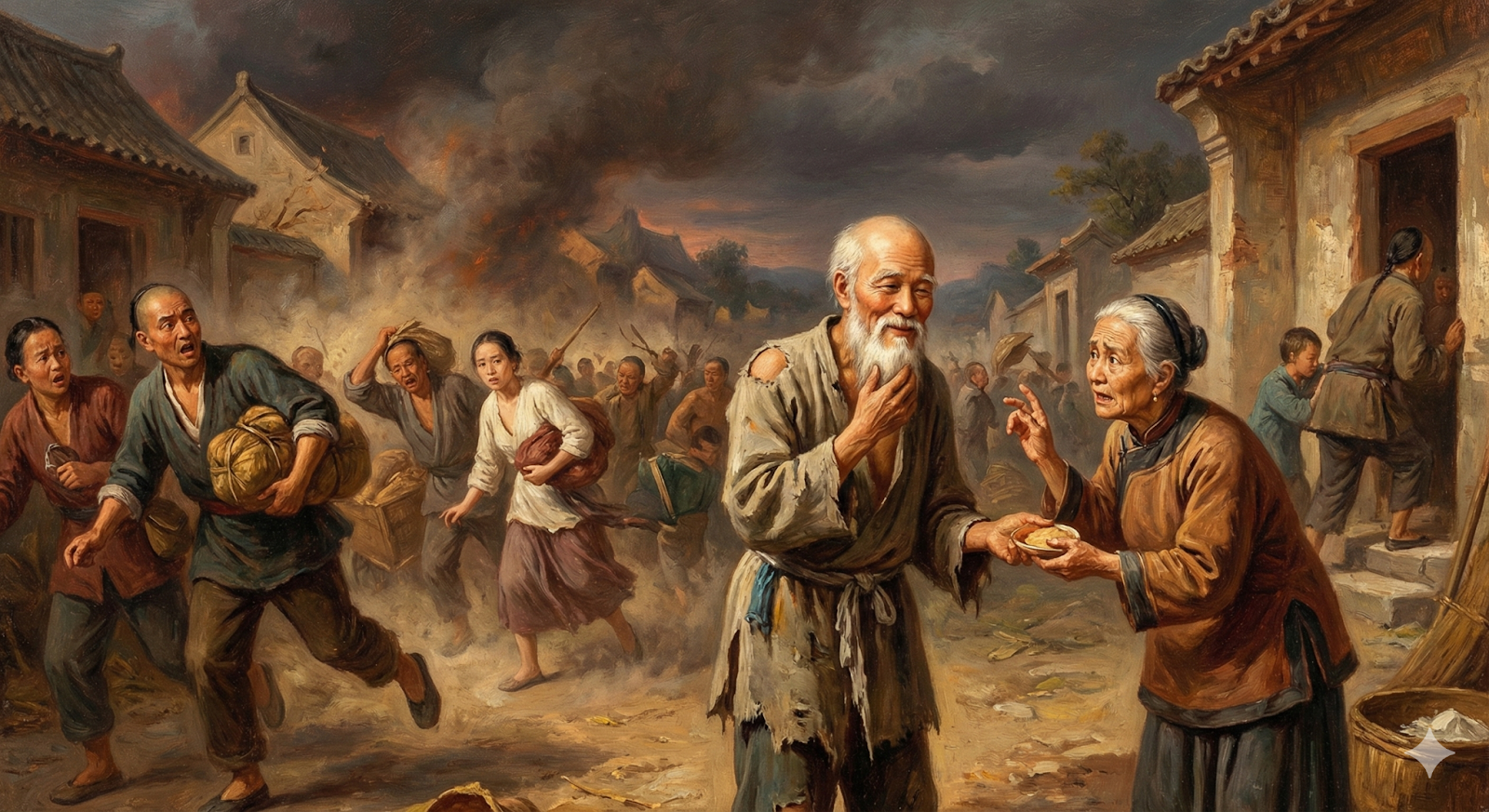 ในขณะที่ทุกคนกำลังเก็บข้าวของหนีตายนั้น มีชายชราขอทานคนหนึ่งเดินเข้ามาในหมู่บ้าน ท่าทางของเขาดูสงบนิ่ง แตกต่างจากชาวบ้านที่กำลังตื่นตระหนกยายเฒ่าใจดีคนหนึ่งเห็นเข้า จึงรีบเข้าไปเตือนด้วยความเป็นห่วง